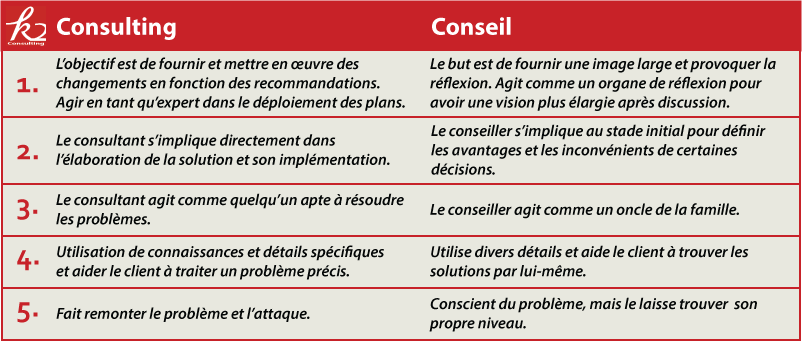 Le consulting est un ensemble de processus et de méthodes utilisés pour faire la différence et instiller le changement pour améliorer une situation, mais n’a aucun control direct tout au long de la mise en œuvre.
