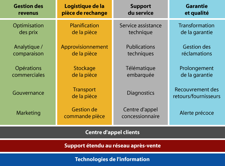 L'approche de K2 Consulting apporte des solutions à chaque élément de chaque activité majeure du cycle de vie de l'après-vente : gestion de revenue et opérations commerciales de la pièce de rechange, logistique de la pièce de rechange, support du service et enfin gestion de la garantie. Ces quatre domaines sont eux-mêmes supportés par les opérations du centre d'appel clients; support étendue au réseau après-vente et aux technologies d'information.