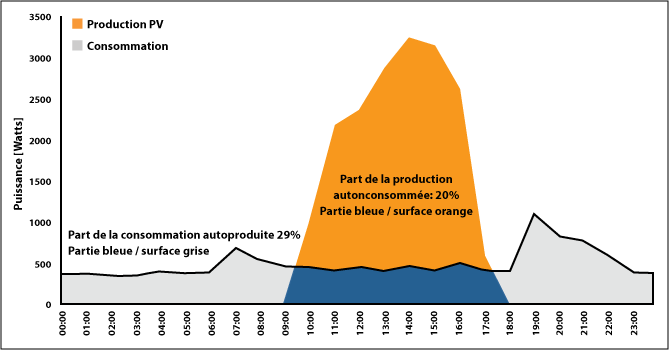 Si la puissance photovoltaïque instantanée est inférieure à la charge : Le complément de puissance est fourni par le réseau |