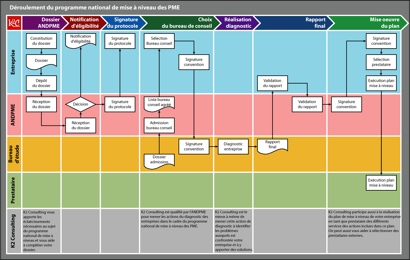 | Si l'entreprise est éligible au programme national de mise à niveau, un protocole d'accord est signé avec l'ANDPME pour la réalisation de la première action de mise à niveau et qui consiste au pré-diagnostic/diagnostic de l'entreprise. |
